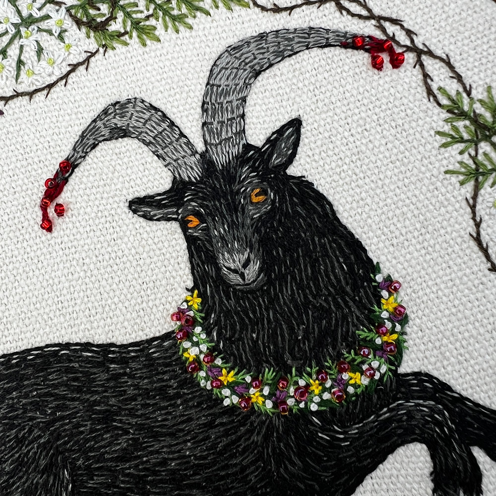 Depicting the devilish goat from cult classic film The Witch, this piece would be the perfect gift for any horror fan. Black Phillip is surrounded by a wreath of Deadly nightshade, Henbane and Hemlock - traditional ingredients in a witches flying ointment.
