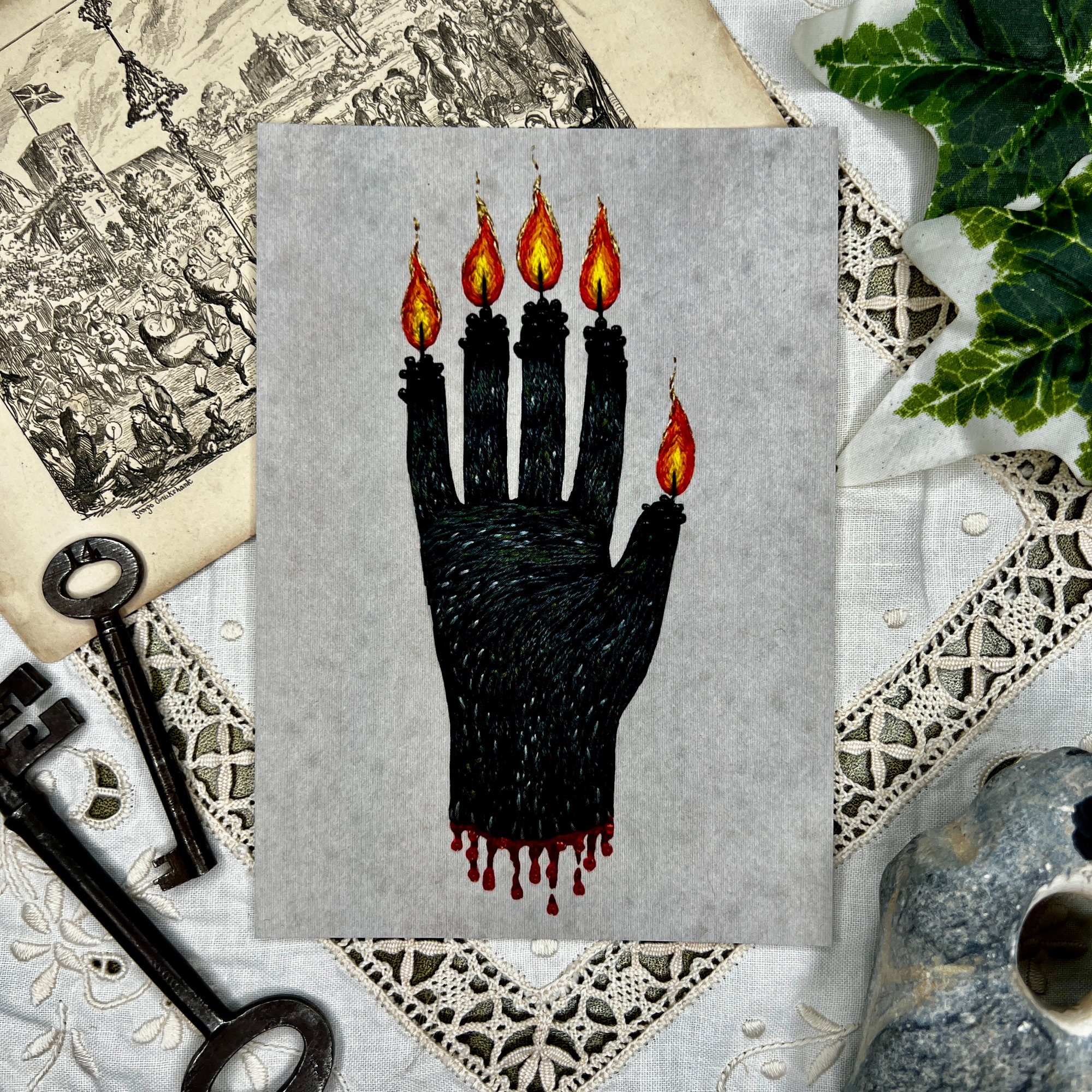This high quality postcard features a print of my embroidered artwork Hand of Glory.